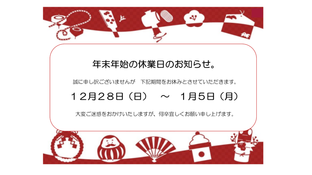 年末年始の営業のお知らせ 12/28-1/5 未分類 2025.12.23 誠に申し訳ございませんが 下記期間をお休みとさせていただきます。 12月28日(日)-1月5日(月) 大変ご迷惑をおかけいたしますが、何卒宜しくお願い申し上げます。